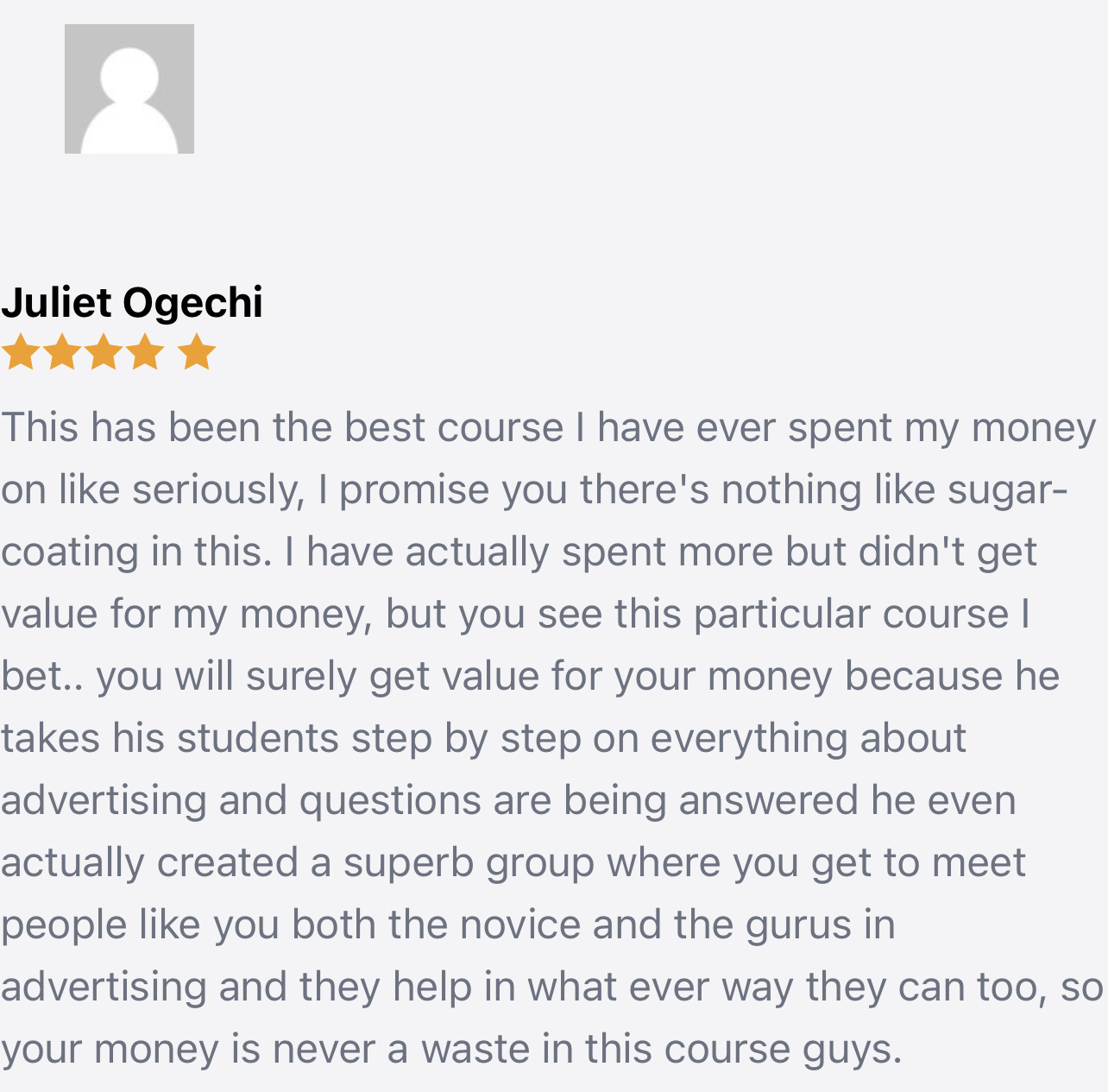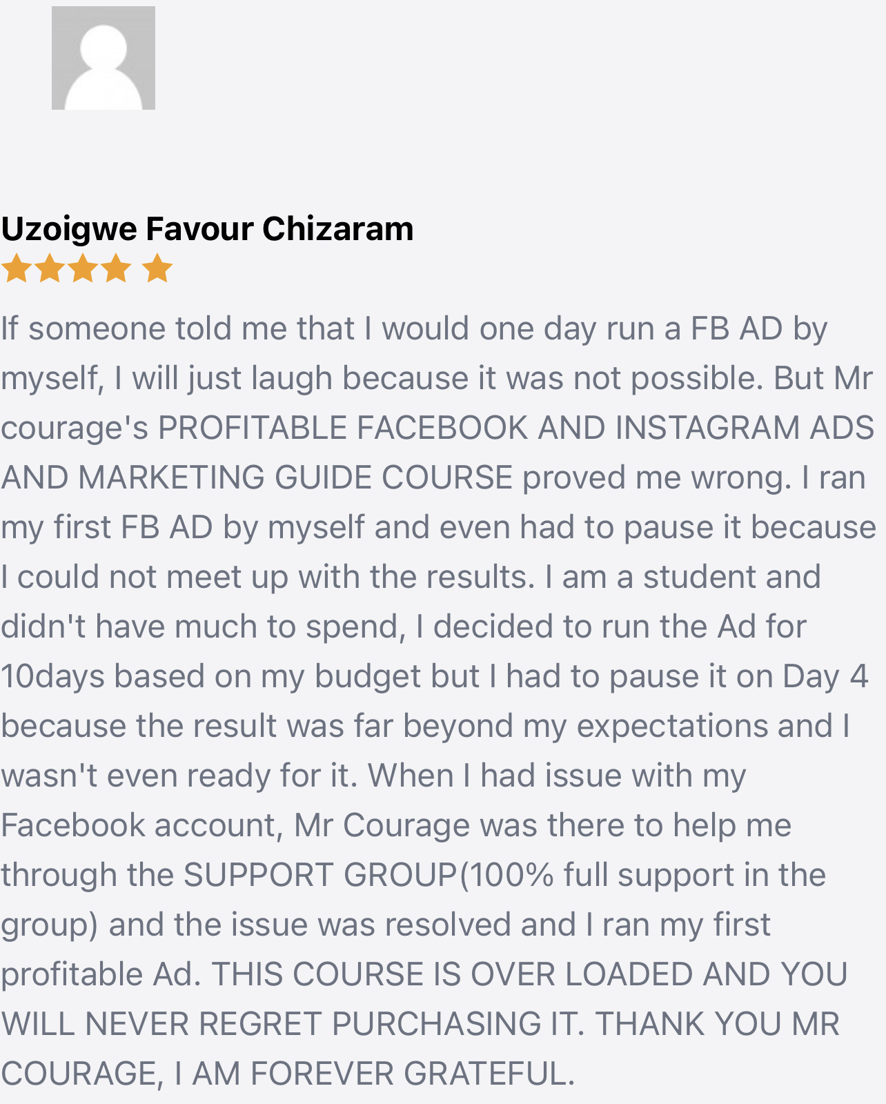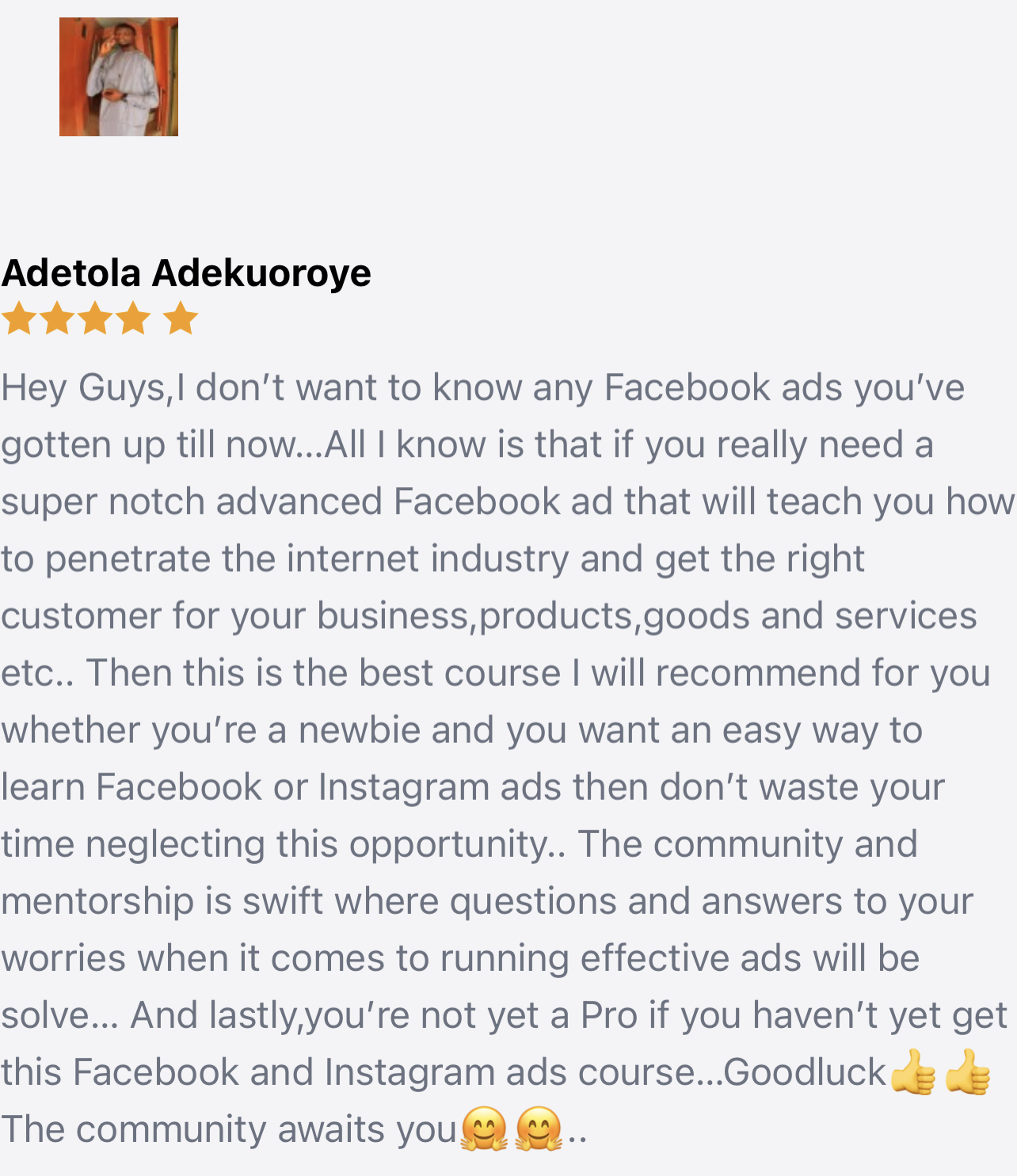 As a way of ensuring you get the best out of this course, there is a support group that would attend to all the questions you might have about this course. Plus you will be able to network with other business owners and Facebook advertisers so that when you encounter any issues with your ads, marketing or business, you will have people to run to and get help.
